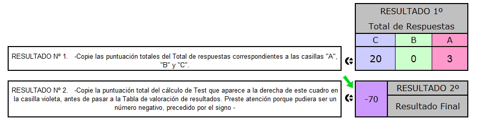 En la tabla inferior los resultados posibles están representadas por dos columnas verticales coloreadas. El rango de puntuaciones de la escala de la izquierda oscila entre los -150 a los 300 puntos obtenidos en los tests: