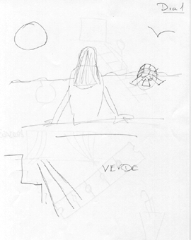 En el dibujo Nº 1 de Antonio se muestra a una muchacha sentada frente al mar. A su derecha lo que parece un animal pequeño con dibujos cuadriculados en el cuerpo