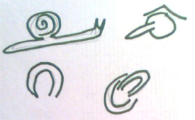 Eulalia dibujó 2 forma de "V" invertida , al igual que Santos, acaso como si fuesen montañas y debajo de ellas otra "V" que parece las alas de un pájaro y que igualmente recuerdan las manecillas de un reloj. Compárelas con las manecillas del reloj de la foto de al lado.
