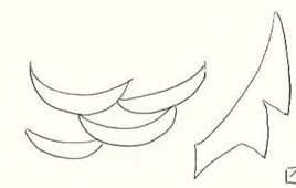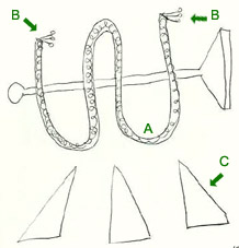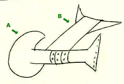 Observe el dibujo de Isabel. Arriba dibuja una forma alargada ("A") con detalles en su superficie que muy bien pudieran parecer las escamas del señuelo. Pero lo más interesante es que en las puntas de dicha figura emergen tres formas que recuerdan a un anzuelo de tres puntas como se destaca abajo. nuestro juicio la relación es indiscutible.