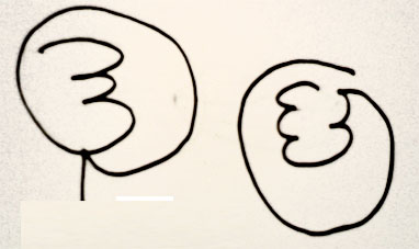 Y debajo de la espiral, Montse dibuja una dorma con una muesca y debajo de ella un trazo vertical que recuerda el segmento medio del señuelo, ¿Acaso la muesca representa el sitio donde se inserta en anzuelo?