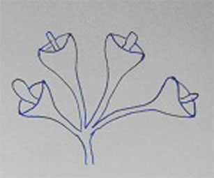 Rosa dibuja una especie de planta. Lo interesante es que está formada por cuatro formas que recuerdan a flores, pero también a cuatro cucharas, con la concavidad de su cabeza o "pala" en el extremo y el "manguito" de su cuerpo para agarrarla. Y dentro de las concavidades de esas "Flores" aparecen cuatro formas idénticas a las cápsulas contenidas en las cuatro cucharas de la foto.