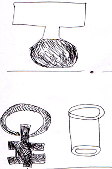 El dibujo inferior de la izquierda, es ujna variantre del anterior. solo que esta vez la porción superior, ancha y acaso hueca pudiera representar el cuerpo de cristal de la bombilla y la porción inferior pudiera representar el casquillo metálico con las estrias exageradas de las roscas