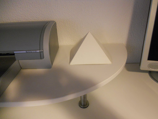 Sobre esa repisa y a la derecha de la impresora, he colocado una pirámide idéntica a las utilizadas en clases y dentro de la pirámide he colocado un objeto...