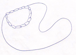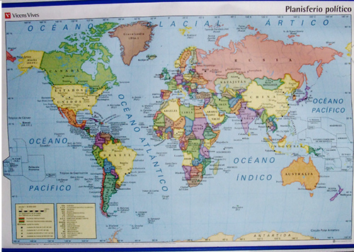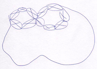 Los dos dibujos de Javier representa igualmente formas amorfas. fundamentalmente el dibujo Nº 2. En este caso las formas ya ocupan espacios y sus perfiles son distorsionados como las siluetas de los continentes. En el dibujo Nº 3, abajo, se observa que incluye letras. Mezcla las letras con esa formas que recuerdan un mapa. Pero coynturalmente el planisferio no solo muestra los perímetros de lso continentes y los países, sino que incluye letras formando los nombres de cada lugar. Creo que esa relación convierte en significativo a sus dibujos. |