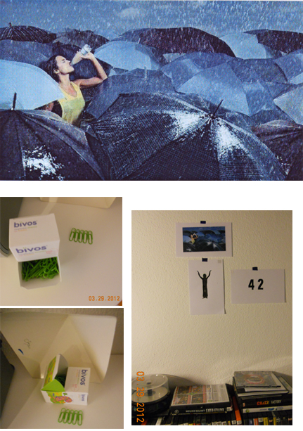Y la foto que está pegada en la pared es el de una mujer bebiendo agua de una botella bajo la lluvia y que emerge de un grupo de paraguas.