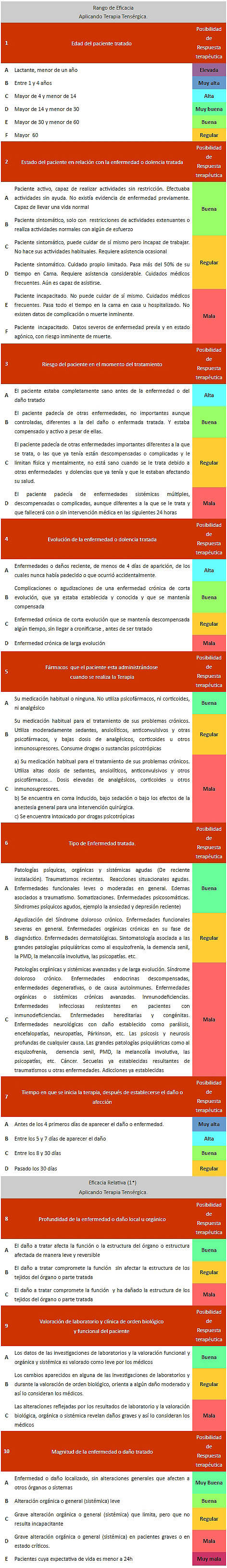 En la tabla, que a continuación se muestra, ofrecemos los diferentes rangos de eficacia esperada, en base a las características del paciente, cuando se practica la Terapia Energética o Terapia Tensérgica, en la segunda atención.